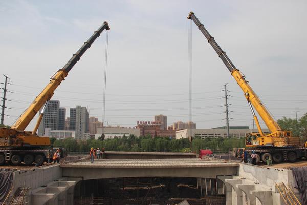 5月18日上午9時,濱河南路拓寬改造工程第一塊T型板梁正式開始吊裝。該橋設計寬26米,橋跨18米,橋型為一跨簡支變截面肋梁橋,主梁采用裝配式后張預應力混凝土變截面T梁,吊裝后濕接。經過連續不間斷作業,于下午16時圓滿完成七塊主梁、兩塊邊梁,共計九塊板梁的吊裝任務,比原計劃提前一天,至此標志著橋梁主體結構工程順利完成。