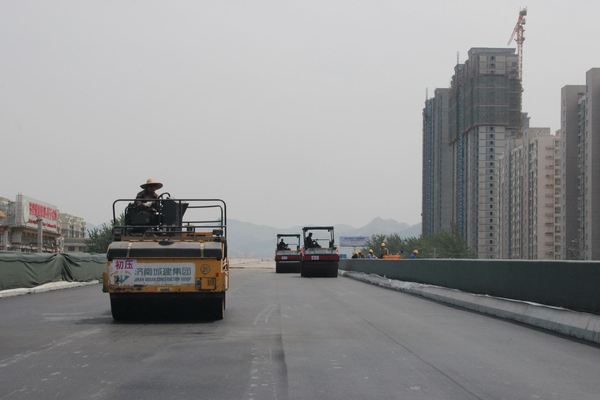 二環南西段四標橋面進行防水瀝青試驗段攤鋪
