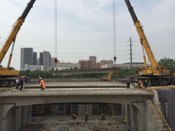 5月18日上午9時(shí),濱河南路拓寬改造工程第一塊T型板梁正式開始吊裝。該橋設(shè)計(jì)寬26米,橋跨18米,橋型為一跨簡支變截面肋梁橋,主梁采用裝配式后張預(yù)應(yīng)力混凝土變截面T梁,吊裝后濕接。經(jīng)過連續(xù)不間斷作業(yè),于下午16時(shí)圓滿完成七塊主梁、兩塊邊梁,共計(jì)九塊板梁的吊裝任務(wù),比原計(jì)劃提前一天,至此標(biāo)志著橋梁主體結(jié)構(gòu)工程順利完成。