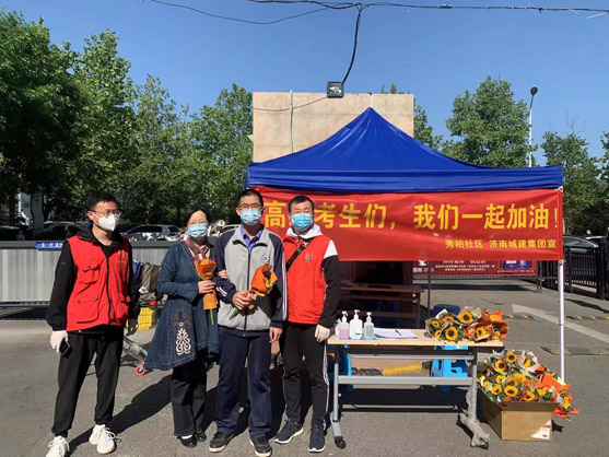 “高三考生們,我們一起加油!” 在領(lǐng)秀城秀柏社區(qū)的防疫志愿服務(wù)站,一條大紅色的條幅,一朵朵象征著太陽(yáng)與光明、生機(jī)與活力的太陽(yáng)花在陽(yáng)光的照射下格外絢爛醒目。今天是五一勞動(dòng)節(jié)也是高三考生因疫情封閉后第一天復(fù)課的日子。 在這個(gè)特別的節(jié)日里,領(lǐng)秀城秀柏社區(qū)的防疫先鋒隊(duì)第一小組組長(zhǎng)榮峰提前一天就定購(gòu)好了100朵鮮花,一大早,當(dāng)高三學(xué)生走到小區(qū)門口,志愿者們就將一朵朵鮮艷的太陽(yáng)花和祝福卡送到學(xué)生手中,“想起了向日葵就想起了陽(yáng)光,微笑和美好常在,我們一起加油!” “叔叔,太謝謝你們了,你們?cè)诩影嗉狱c(diǎn)為我們服務(wù),還給我們送花,真是讓我倍受鼓舞。”“太感謝你們了,謝謝志愿者們這些日子以來對(duì)我們